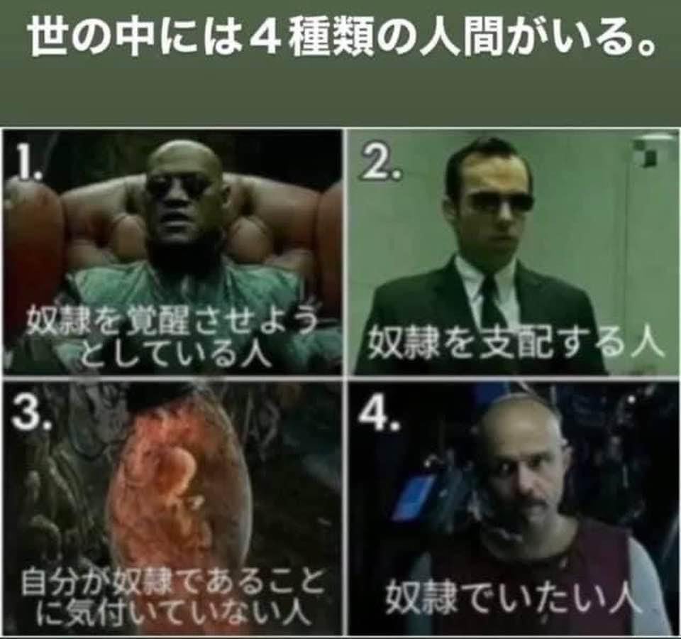 「4」は中間支配層と、一概には言えませんが今の生活(仕事、財産、人間関係)を壊したくないから、あえてワクチンを打つ一般人です。